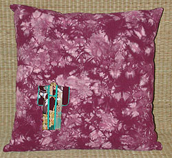 Pictured: Hand-Painted Silk Noil front, natural back, both then Hand-Dyed. Embellished with an Origami Kimono Ornament. Lapped back closure. Painted and Dyed Silk: Painted with blue and yellow, then Shibori over-dyed Fuchsia. Ornament: Purple, fuchsia, turquoise, blue, gold, white, teal, metallic gold. Size: 18 x 18 inches. Shipping: FREE IN USA! One-of-a-Kind, from a Limited Edition Series.