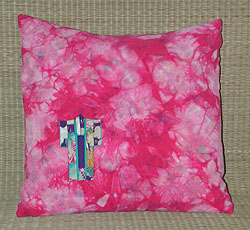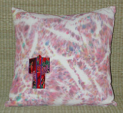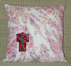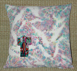 Pictured: Hand-Painted Silk Noil front, embellished with an Origami Kimono Ornament. Natural back. Zipper. Hand-Painted Silk: Purple, blue, carmine, lime, pink, yellow, teal on cream. Ornament: Teal, fuchsia, orchid, white, black, rust, metallic gold. Size: 18 x 18 inches. Shipping: FREE IN USA! One-of-a-Kind, from a Limited Edition Series. |