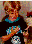During the summer if you find a caterpillar, you can bring it inside, along with lots of the leaves from the plant you found it on. We usually put the stems of the plant in some water and put the plant and the caterpillar in a container like a jar or coffee can. Make sure the caterpillar can get some air in whatever container you use. If you start out with a pretty big caterpillar then within a day or two, it will form into a chrysallis. Then you can take it out of the container so that you will have a good view of the butterfly when it hatches. This will probably take one or two weeks. Check the chrysallis each day. Be sure to have some fresh flowers for the new butterfly and be careful not to touch it until the wings are fully open and dry. This is a picture of me holding a newly hatched swallowtail. She crawled all over my brother and me and then after a day in the house we took her outside and put her in the garden.